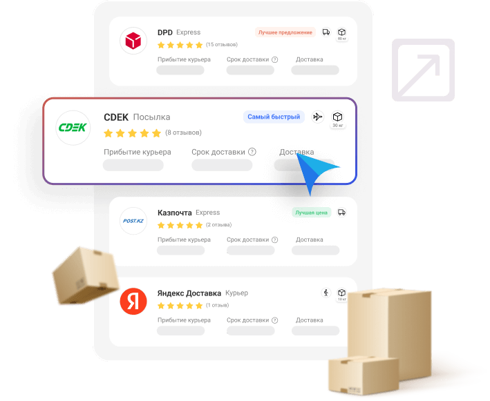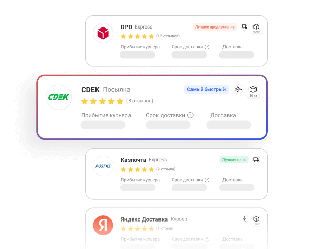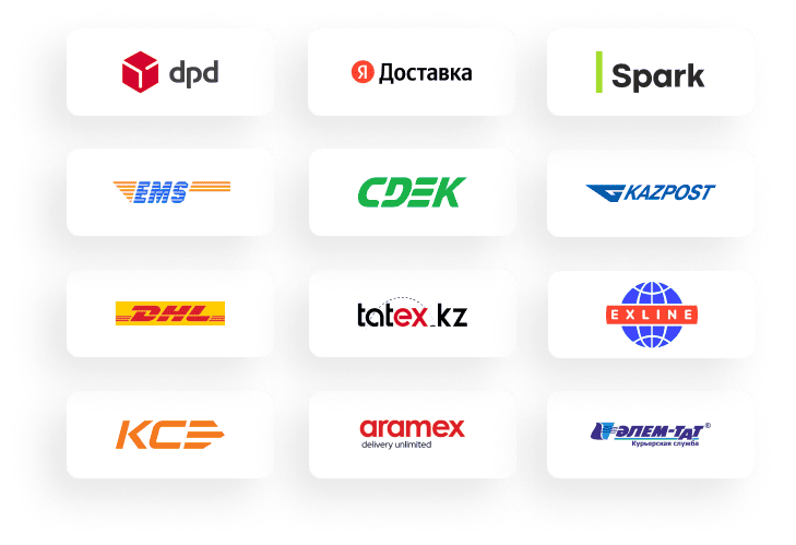 Мы сотрудничаем с надежными курьерскими компаниями: DPD, Яндекс Доставка, Әлем-ТАТ, EMS, CDEK, Kazpost (Казпочта), Aramex, DHL, Tatex.kz, Exline, Spark, KCE. Вы можете сравнивать тарифы, сроки и условия доставки, выбирая оптимальный вариант для вашего бизнеса.